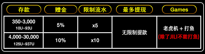* The deposit amount to get the USDT pro must be played on slots and fish only. *